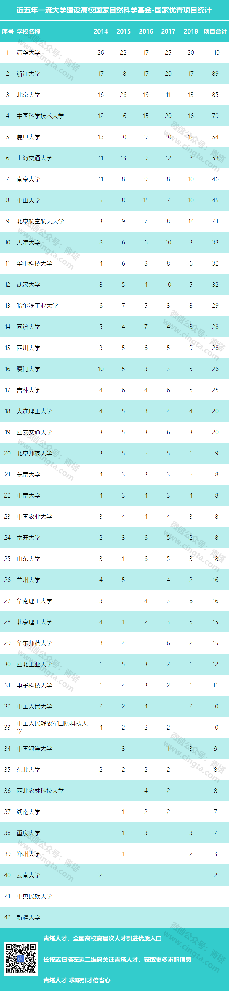 從國家優(yōu)青項目統(tǒng)計結(jié)果來看,近五年來清華大學在國家優(yōu)青項目數(shù)量最多,達到110項,遠超其他一流大學,居第一位;浙江大學、北京大學緊隨其后,分別有89項和85項,居第二位和第三位;中國科學技術(shù)大學、復旦大學和上海交通大學國家優(yōu)青項目數(shù)量在50項以上,南京大學、中山大學、北京航空航天大學、天津大學、華中科技大學等13所高校國家優(yōu)青項目數(shù)量在20項以上;而中國海洋大學、東北大學、西北農(nóng)林科技大學、湖南大學、重慶大學、鄭州大學和云南大學五年獲國家優(yōu)青項目數(shù)量在10項以下;此外,中央民族大學和新疆大學五年來未獲國家優(yōu)青項目資助。