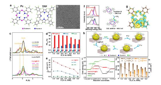 最近,在國家自然科學(xué)基金委、科技部和中國科學(xué)院的支持下,胡勁松課題組在氮摻雜碳類CO2RR催化機(jī)制研究方面取得重要進(jìn)展,發(fā)展了顯著提高其性能的新策略。氮摻雜碳基納米材料作為廉價(jià)非金屬CO2RR催化劑備受關(guān)注,但因其結(jié)構(gòu)復(fù)雜,難以精確控制,導(dǎo)致對(duì)其催化活性位點(diǎn)的認(rèn)識(shí)仍存在較大爭議,催化性能也亟待大幅提升。利用結(jié)構(gòu)明確的小分子作為模型催化劑是明晰其催化機(jī)制的有效手段,但小分子自身的催化活性低,實(shí)驗(yàn)誤差大,難以給出可信結(jié)果。研究人員發(fā)現(xiàn)將含氮小分子模型催化劑(酞菁(Pc)和四苯基卟啉(TPP),圖a)與超小鈷納米晶(圖b,c)結(jié)合,可以顯著提升其催化CO2RR的選擇性(法拉第效率,圖d)和活性(電流密度,圖e)(-0.9 V下分別提升18和47倍)。這種放大效應(yīng)使利用模型小分子揭示氮摻雜碳類材料的催化機(jī)制成為可能。實(shí)驗(yàn)結(jié)果與理論計(jì)算表明CO2RR優(yōu)先發(fā)生在吡啶氮而不是吡咯氮上(圖f-h);而且金屬態(tài)鈷可以顯著降低吡啶氮上CO2RR決速步驟的能壘,從而提升其催化性能(圖i)。電化學(xué)實(shí)驗(yàn)進(jìn)一步證實(shí)含吡啶氮的酞菁分子催化CO2RR的活性和選擇性都比只含吡咯氮的卟啉分子在相同氮含量下高出數(shù)倍(圖j)。這些結(jié)果揭示了氮摻雜碳類催化劑中吡啶型氮碳位點(diǎn)電催化還原CO2性能明顯高于吡咯氮摻雜碳位點(diǎn),并且通過調(diào)控吡啶型氮碳位點(diǎn)電子結(jié)構(gòu)可以顯著提升其催化活性與選擇性。該研究工作為合理設(shè)計(jì)高效、低成本CO2RR碳基電催化劑提供了有益的參考,相關(guān)結(jié)果發(fā)表于德國應(yīng)用化學(xué)(Angew. Chem. Int. Ed.2020, Doi: 10.1002/anie.201916520),并被選為VIP論文。論文第一作者是博士生何超。
