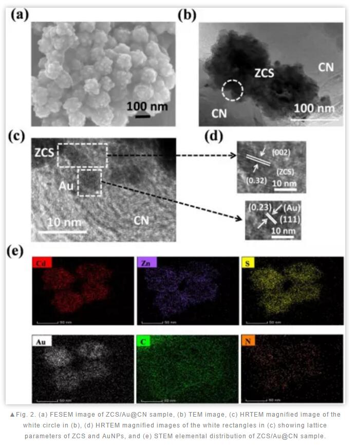 如圖1中的XRD譜圖所示,CN有兩個(gè)明顯的衍射峰,在2θ = 27.6°時(shí)峰值與g-C3N4在(002)衍射面層間的堆積有關(guān),在2θ = 12.7°處(100)面的衍射峰則是由于在平面內(nèi)的tri-s-triazine的重復(fù)單元。共軛芳香族體系的(002)衍射峰比之前報(bào)道的g-C3N4的衍射峰要強(qiáng),這表明,巴比妥酸的加入大大提高了制備的CN的結(jié)晶度,結(jié)晶度的增加可以加速電子在晶面的轉(zhuǎn)移,提高光催化活性。ZCS固溶體樣品的衍射圖形為典型的六邊形和立方結(jié)構(gòu),在(100),(002),(101),(110),(103),(112),(202)面上具有顯著的峰,而(111)、(200)、(311)面與ZCS立方相匹配。此外,所制備的ZCS納米球的衍射峰明顯而尖銳,表現(xiàn)出異常的結(jié)晶性質(zhì)。沒(méi)有額外雜質(zhì),表明制備樣品的相純度高。ZCS/Au和ZCS/Au@CN復(fù)合材料的衍射峰與純ZCS和CN的衍射峰相似。結(jié)果表明,在AuNPs光沉積過(guò)程中,ZCS或CN的相結(jié)構(gòu)沒(méi)有發(fā)生變化。在ZCS/Au@CN樣品中,CN的衍射強(qiáng)度相對(duì)較低,原因是其在復(fù)合材料中的含量較低(5% wt%)。通過(guò)進(jìn)一步的HRTEM、XPS分析和UV-Vis中的波段漂移,可以發(fā)現(xiàn)制備樣品中AuNPs和CN的清晰存在(圖2)。
