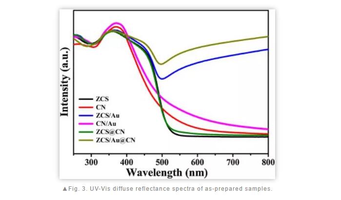為了研究制備的光催化劑的捕光性能和CO2還原性能,我們記錄了所有制備樣品的UV-vis DRS光譜。從圖3可以看出,ZCS及CN在300-500nm有很強(qiáng)的強(qiáng)度,說(shuō)明在可見(jiàn)光照射的情況下,兩個(gè)樣品都可以被激發(fā)。即使CN在ZCS表面沉積后,ZCS@CN的吸收強(qiáng)度也沒(méi)有明顯變化。它只顯示在可見(jiàn)光范圍內(nèi)的吸收有輕微的紅移,而紫外吸收略有下降。然而,ZCS和ZCS@CN在波長(zhǎng)短于523nm時(shí)顯示出很強(qiáng)的吸收。這個(gè)結(jié)果表明CN是在表面上積累的,而不是在ZCS納米球的晶格內(nèi)。與純CN相比,在CN/Au樣品中引入AuNPs后,可見(jiàn)光區(qū)的光吸收得到了改善。與純ZCS相比,ZCS/Au和ZCS/Au@CN樣品在可見(jiàn)光區(qū)表現(xiàn)出很強(qiáng)的光吸附性能,尤其是在500 - 800nm處,這一事實(shí)反映了AuNPs和ZCS階段之間的強(qiáng)烈交互作用。這種吸收向長(zhǎng)波長(zhǎng)的轉(zhuǎn)移與ZCS價(jià)帶到AuNPs表面的直接界面電荷遷移率有關(guān)。這一觀察結(jié)果表明,制備的復(fù)合材料樣品同樣可以在完全可見(jiàn)光范圍內(nèi)被激發(fā)。