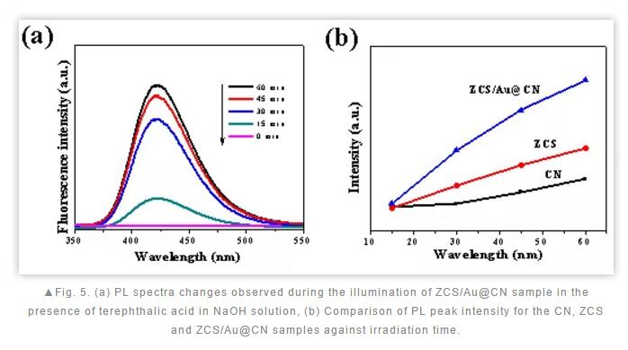 通過(guò)用苯二甲酸(TA)合成2-羥基對(duì)苯二甲酸(HTA),在325nm的激發(fā)波長(zhǎng)下進(jìn)行了室溫光致發(fā)光(PL)光譜分析。羥基自由基捕獲測(cè)試被認(rèn)為是驗(yàn)證直接Z-Scheme光催化劑的最重要的方法之一,其中,OH-/H2O可以通過(guò)與半導(dǎo)體上的光生空穴反應(yīng)生成?OH自由基。ZCS/Au@CN光催化劑在不同光照時(shí)間下的PL光譜變化如圖5a所示。樣品中HTA的PL強(qiáng)度隨光照射時(shí)間的增加而增加。這一效應(yīng)表明,CN上的光生成空穴沒(méi)有足夠的氧化電位與OH-/H2O反應(yīng)生成?OH自由基,這表明光生成空穴在ZCS表面積累,如圖5b。