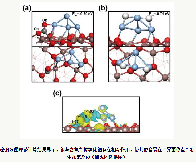 研究人員首先通過密度泛函理論計算,分析了銀與含氧空位氧化銦表面之間的相互作用。計算結(jié)果發(fā)現(xiàn),二者之間的“界面位點”能夠很好地活化二氧化碳分子,使其更容易在該位點發(fā)生加氫反應(yīng)。