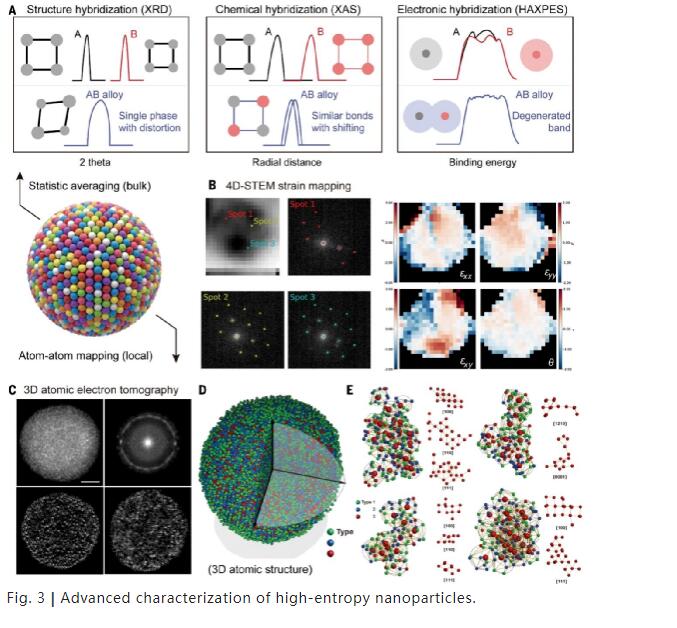 高熵納米粒子應顯示單相結構,表明組成元素的均勻和隨機混合。然而,這種多元素的隨機混合及其協(xié)同作用的表征非常具有挑戰(zhàn)性。常規(guī)表征技術,如X射線衍射、掃描和透射電子顯微鏡以及 X 射線光電子能譜(XPS),可以幫助確定基本相結構 、形態(tài)、元素分布和價態(tài),但可能缺乏解耦多元素混合所需的分辨率。基于同步加速器X射線的技術使用更短的波長,可以提供高分辨率以更好地了解高熵納米粒子的原子排列、鍵合和配位以及電子特性(圖3A)。四維掃描透射電子顯微學(4D-STEM)以及原子電子斷層掃描 (AET)也被用于分析晶格應變以及三維原子結構。