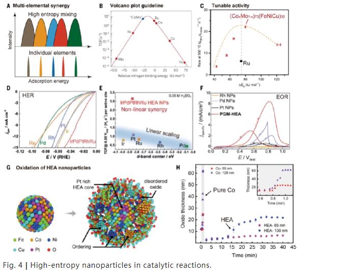 以前高熵合金主要用于結構工程方面的應用。約翰霍普金斯大學王超教授等人首次證明高熵合金納米粒子可以作為熱催化中的高效催化劑。在催化反應中,反應物或中間體與催化劑表面的結合既不能太強也不能太弱(Sabatier 原理)以最大限度地提高性能,從而顯示出活性對結合能的依賴性的“火山圖”。