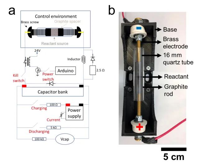 圖2. 閃速焦耳加熱裝置電路圖及實物。圖片來源:Adv. Mater.
