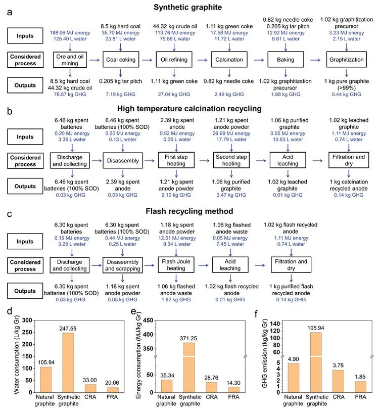 近日,美國萊斯大學(xué)James M. Tour教授課題組提出了一種超快的“閃熱回收(flash recycling)”方法再生石墨負(fù)極,同時還可回收寶貴的電池金屬資源。他們使用的關(guān)鍵技術(shù)是此前發(fā)過Nature 的閃速焦耳加熱(flash Joule heating, FJH),通過高壓放電在不到1秒的時間內(nèi)就可達到3000 K以上的高溫,以快速制備石墨烯(Nature, 2020, 577, 647,點擊閱讀詳細(xì))。在本文中,他們將這項技術(shù)進行了調(diào)整,用于再生石墨負(fù)極。僅需幾秒鐘的選擇性焦耳加熱,廢石墨負(fù)極中的電阻性雜質(zhì)就被有效分解。產(chǎn)生的無機鹽,包括Li、Co、Ni和Mn,可以使用稀釋的酸(0.1 M HCl)很容易地從處理過的廢負(fù)極中回收。與使用高溫煅燒方法回收的負(fù)極材料相比,閃熱回收的負(fù)極保留了石墨結(jié)構(gòu),并且外覆一層固體電解質(zhì)界面(SEI)衍生的碳?xì)?,使其具有?yōu)良的電化學(xué)性能,完全可以再次用于鋰離子電池。對現(xiàn)有石墨生產(chǎn)和回收方法的生命周期分析表明,閃熱回收可以顯著降低總能耗和溫室氣體排放,同時使負(fù)極回收成為在經(jīng)濟上有利的過程。相關(guān)論文發(fā)表于Advanced Materials 雜志。