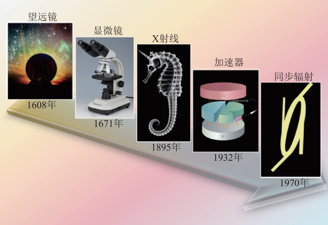 20世紀20年代,加速器的發(fā)明,開啟了人類用高能粒子來研究微觀世界的時代。加速器通過電磁場使帶電粒子加速,其獲得的能量和加速長度成正比。而為了獲得更高能量的粒子,需要不斷增加加速器的長度,由此科學家發(fā)明了環(huán)形回旋加速器。由于被加速粒子質(zhì)量和能量之間的制約,傳統(tǒng)的回旋加速器無法得到較高能量的粒子。為此,科學家們進一步研發(fā)出了同步回旋加速器,其磁場強度與粒子能量呈正相關,粒子回旋頻率與高頻加速電場同步,突破了傳統(tǒng)回旋加速器的能量限制,在此基礎上又進一步發(fā)展了同步加速器技術(shù),以實現(xiàn)更高能量的粒子加速。但是高能粒子在閉合的環(huán)形加速器中運動時,當運動方向改變時,會在切線方向發(fā)出輻射,造成能量損失。在同步加速器上,第一次實驗觀察到引起加速粒子能量損失的輻射,這種輻射被稱為“同步輻射”(圖1)。