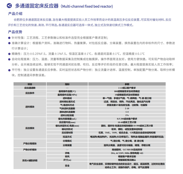 多通道固定床反應(yīng)器: 合肥原位多通道固定床反應(yīng)器,旨在最大程度提高實(shí)驗(yàn)人員工作效率而設(shè)計(jì)的高溫高壓多位反應(yīng)裝置,可實(shí)現(xiàn)對催化材料、反應(yīng)評價和工藝優(yōu)化的快速、高效、平行篩選。各通道反應(yīng)器可選擇一體式、獨(dú)立式及快速切換式工作模式。 產(chǎn)品優(yōu)勢: 針對性強(qiáng):工藝流程、工藝參數(shù)追認(rèn)和標(biāo)準(zhǔn)件選型完全根據(jù)客戶需求定制; 準(zhǔn)確計(jì)算設(shè)計(jì):根據(jù)客戶資料,準(zhǔn)確進(jìn)行物料、熱增衡算,對包括反應(yīng)器、分離裝置、換熱裝置在內(nèi)的非標(biāo)件的尺寸、參數(shù)進(jìn)行計(jì)算設(shè)計(jì); 精確性:壓力±0.25%F.S,流量±1%F.S,恒溫區(qū)溫差±1℃,各通道間混差±1℃,控溫精度±0.1℃ 自動化程度高:壓力、溫度、流量等數(shù)據(jù)采集及控制集成在觸摸屏,操作界面簡潔友好,使用方便快捷??蓪?shí)現(xiàn)產(chǎn)物自動取樣分析,全天候連續(xù)運(yùn)轉(zhuǎn)。能夠?qū)崿F(xiàn)不同通道間前處理、吹掃、反應(yīng)等評價階段的任意切換,最大程度提高實(shí)驗(yàn)人員工作效率; 平行性:獨(dú)立設(shè)置各通道反應(yīng)參數(shù)、實(shí)時監(jiān)控狀態(tài)和產(chǎn)物分析:獨(dú)立流量計(jì)進(jìn)樣、溫度控制,單獨(dú)配置產(chǎn)物分離、取樣分析模塊,控制通道間參數(shù)誤差。