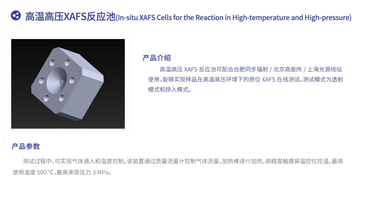 高溫高壓XAFS反應(yīng)池可配合合肥同步輻射,北京高能所,上海光源線站使用,能夠?qū)崿F(xiàn)樣品在高溫高壓環(huán)境下的原位XAFS在線測試,測試模式為透射模式和掠入模式。